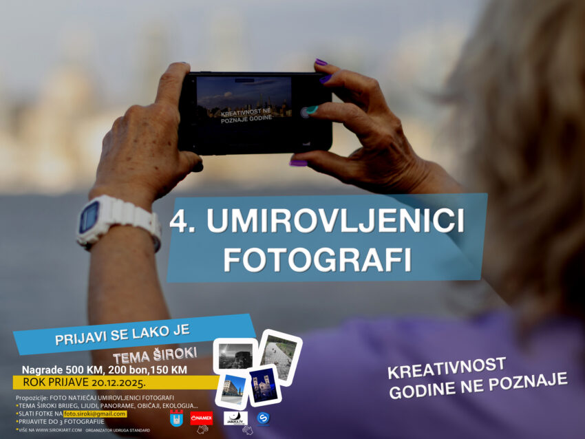Široki Brijeg – S ponosom najavljujemo 4. Foto natječaj namijenjen isključivo umirovljenicima, s ciljem poticanja njihove dodatne uključenosti u kulturni i umjetnički život zajednice. Ponajviše potporom Grada Širokog Brijega, udruga Standard nastavlja sa ovim jedinstvenim foto projektom. Ovaj natječaj slavi iskustvo, senzibilitet i stvaralačku energiju starije generacije. Umirovljenice i umirovljenici često čuvaju bogatstvo uspomena, znanja…